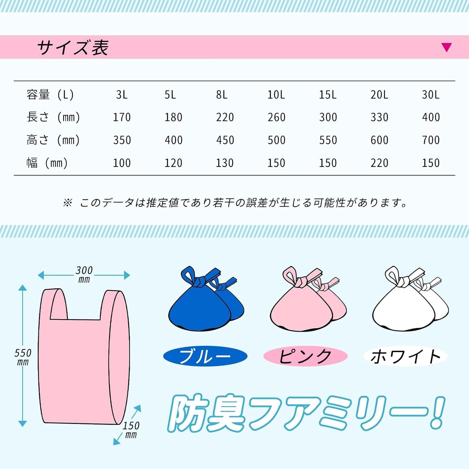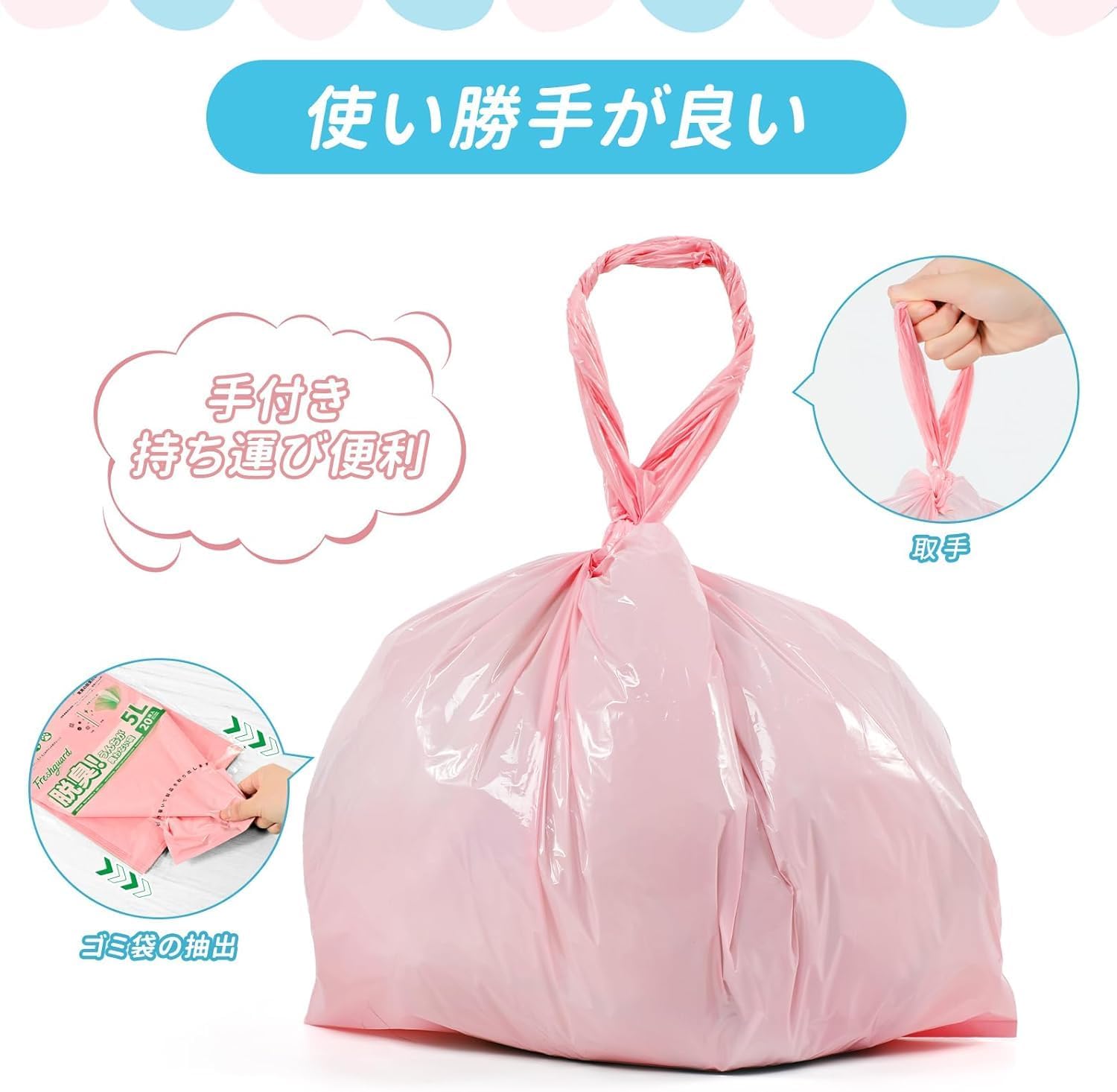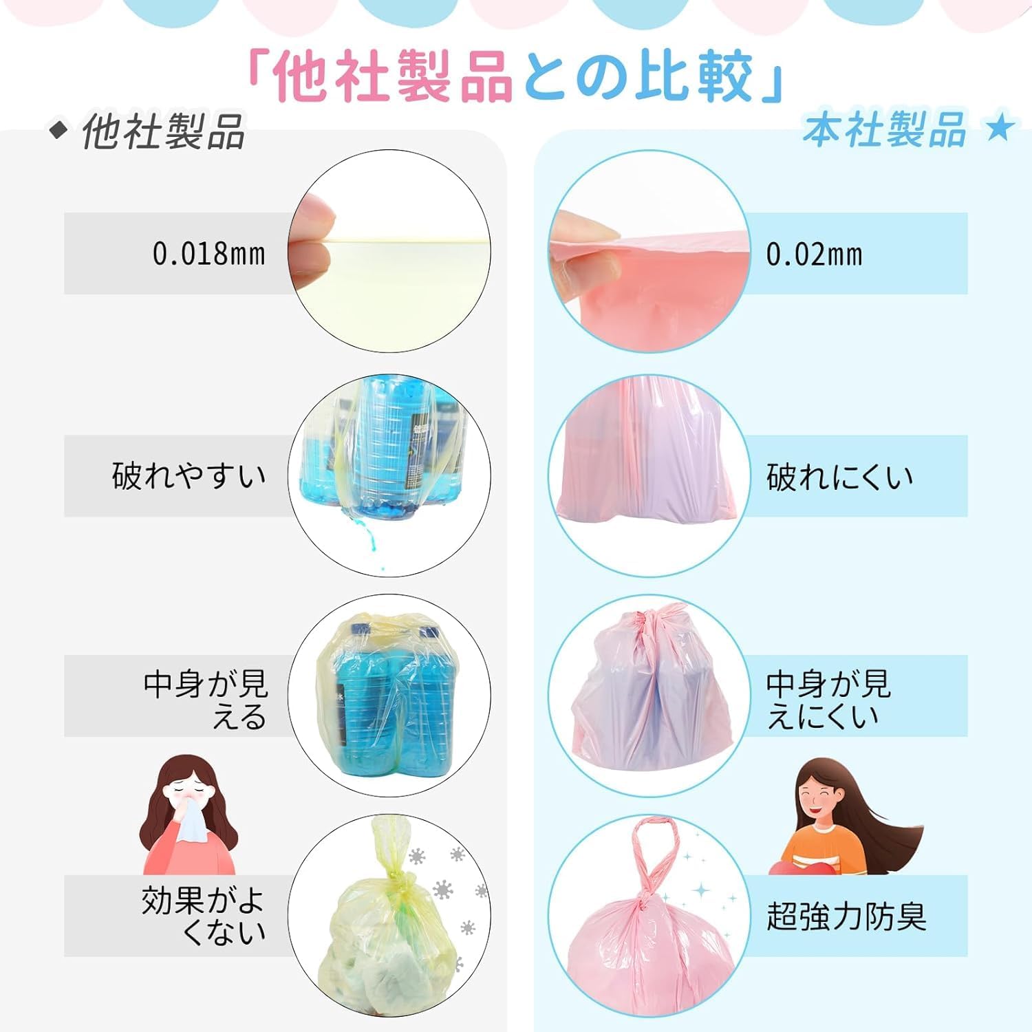 【3 つのカラーでインテリアにマッチ】 ピンク、ホワイト、ブルーの 3 つのカラーバリエーションが用意されています。各カラーは明るく清潔感があり、室内のインテリアに合わせて自由に選べます。さらに、これらのゴミ袋は半透明仕様で、中身がはっきり見えないため、プライバシーをしっかり保護します。「ブルー」は透明タイプなのに、防臭性能は他の製品と全然変わらないよ。中身がすぐ見えるから、取り出すときもムダな手間がないんだ。